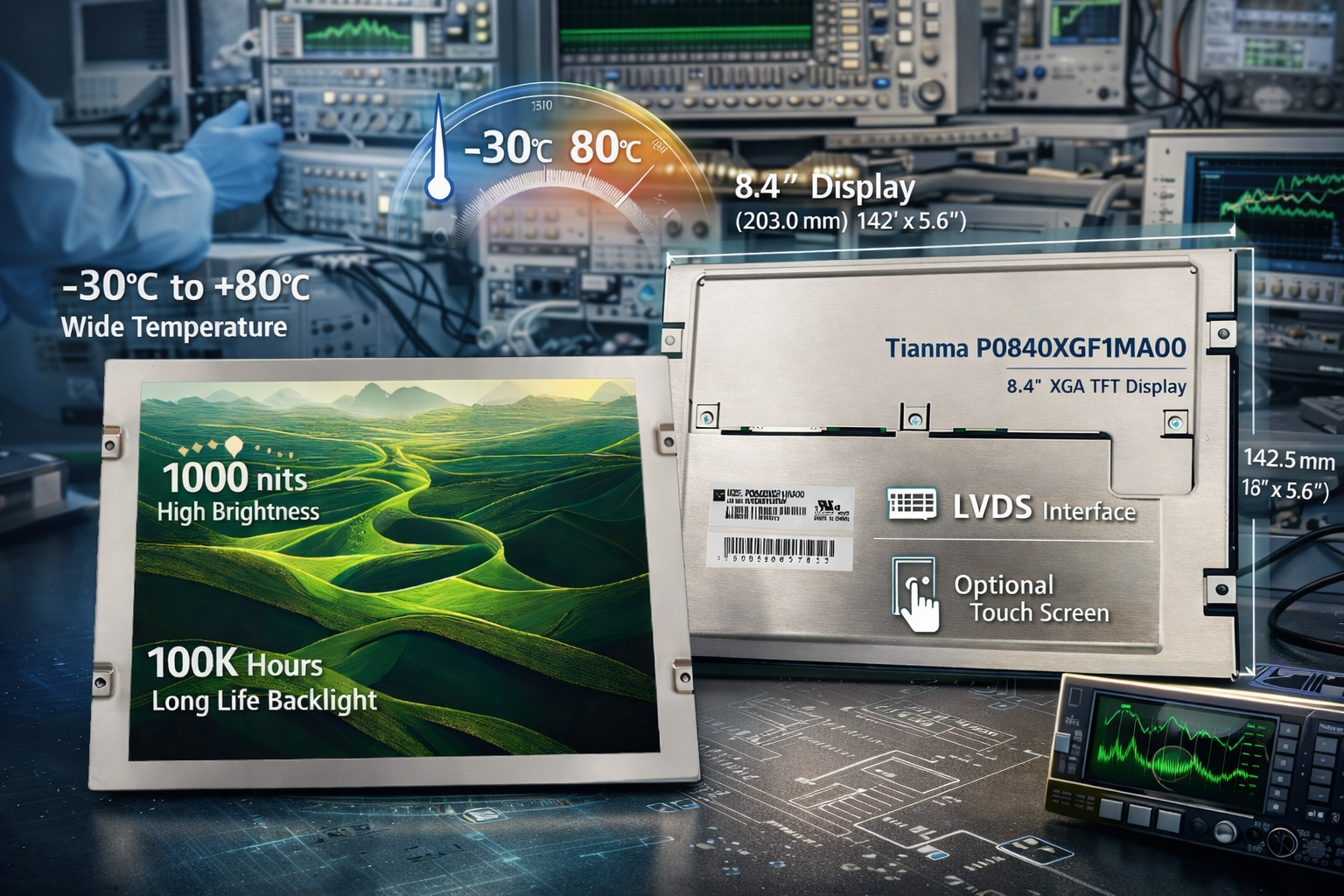 Offering exceptional brightness of 1000 nits and a wide operating temperature range from −30°C to +80°C, this display ensures optimal visibility and performance in diverse environments. Its extended backlight lifespan of 100K hours reduces maintenance needs, providing reliable functionality. Elevate your instrumentation systems with a display that balances high performance and space efficiency.