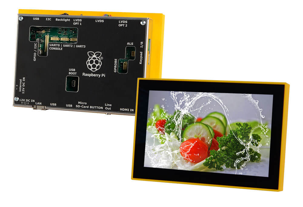 The 7" IoT-CP-AM-1280800P2TZQW-00H-00 IoT Compact Panel with integrated 10-finger touchscreen is a ready-to-use TFT solution with the Raspberry Pi based Artista-IoT TFT controller. This is protected by a box and mounted on the back of the TFT display to save space. The integrated passive cooling makes it possible to operate the system under full load even at high ambient temperatures.