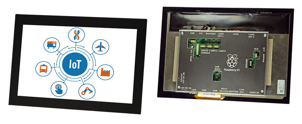 The 10.1" IoT-CP-TM101JDHG30-00-00 IoT Compact Panel with integrated 5 finger PCAP touchscreen is a plug-and-play TFT display solution with the Raspberry Pi based Artista-IoT TFT Controller, which is protected by a box and mounted on the back of the TFT display. The integrated passive cooling allows for operating the system under full load even at high ambient temperatures.